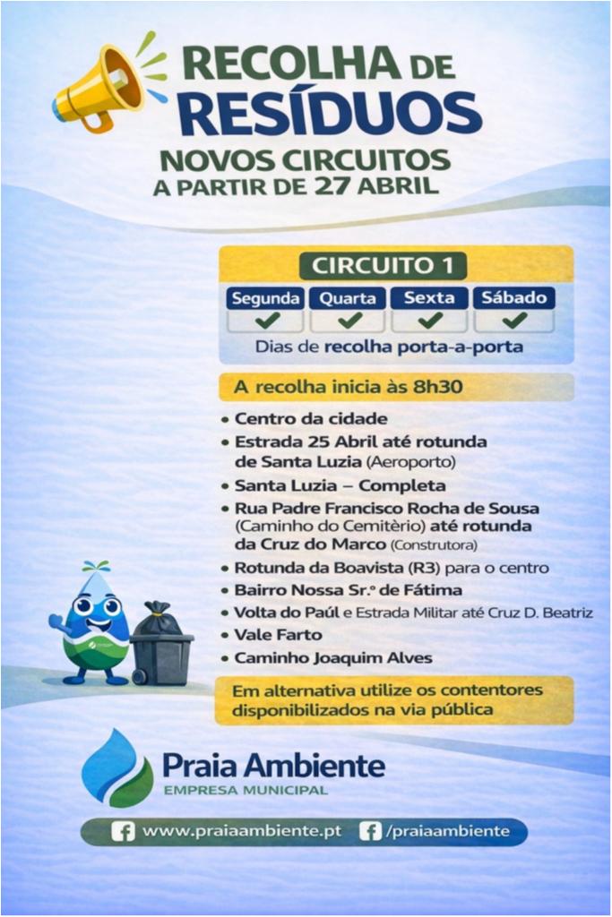 A Junta de Freguesia partilha com a população os novos circuitos de recolha de resíduos, por parte da Praia Ambiente, a partir de 27 de abril.