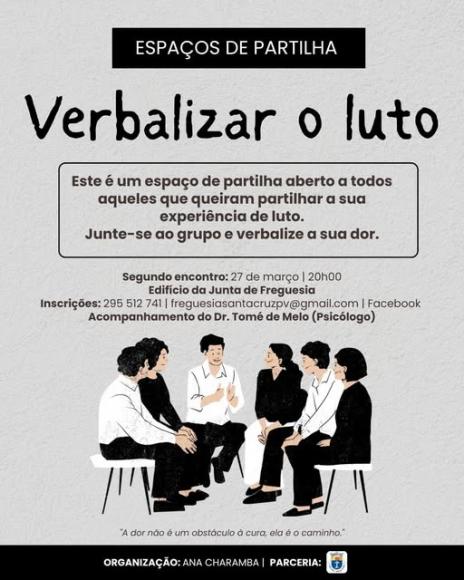 A Junta de Freguesia informa que o 2º encontro do iniciativa "Verbalizar o Luto", da qual é parceira, acontecerá no próximo dia 27 de março, pelas 20h00, no edifício da Junta de Freguesia. Este é um espaço de partilha aberto a todos aqueles que queiram partilhar a sua experiência de luto. Junte-se ao grupo e verbalize a sua dor, com o acompanhamento especializado do Dr. Tomé de Melo (Psicólogo). Inscrições: 295 512 741; freguesiasantacruzpv@gmail.com; Facebook da Junta de Freguesia;Santa Cruz em Renovação!