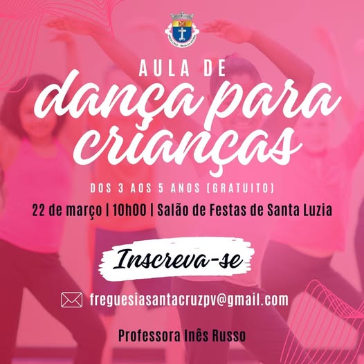 A Junta de Freguesia irá promover uma aula de dança, totalmente gratuita, para crianças (dos 3 aos 5 anos), no próximo dia 22 de março, pelas 10h00, no Salão de Festas de Santa Luzia. Esta aula tem como objetivo promover o desenvolvimento motor, emocional, social e criativo das crianças através da dança criativa, explorando o corpo, o espaço e a imaginação.Juntem-se a nós e, através da energia da professora Inês Russo, desfrutem de um momento único.Inscrições (limitadas): freguesiasantacruzpv@gmail.com;Santa Cruz em Renovação!